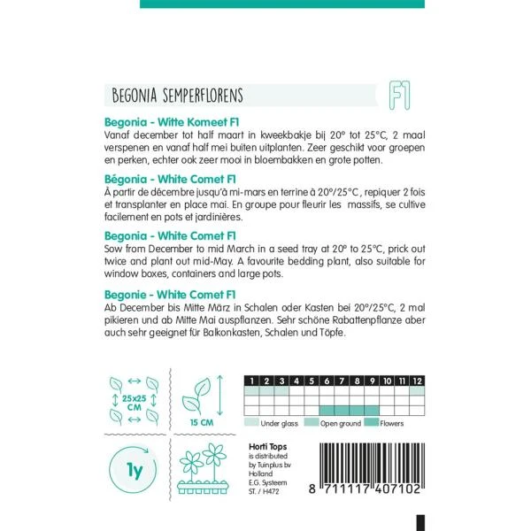 Begonia White Comet, geschikt voor grote groepen in perken maar ook in bakken en potten.