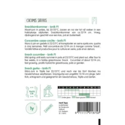 Vroege, rijkdragende soort geschikt voor in de hobbykas, pot of buitenteelt. Deze snackkomkommer wordt ca 12 – 14 cm groot. Van maart tot juni in potjes zaaien bij 22 – 25° C. 4 tot 5 weken later uitplanten.