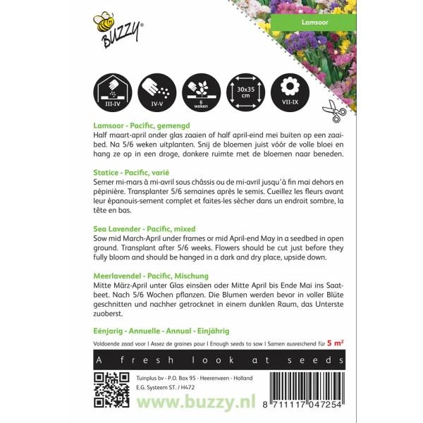 Deze eenjarige planten met hun merkwaardige ‘gelijste’ stelen bloeien lang en zijn uitstekend te drogen. Dit zakje bevat een zaadmengsel dat bloemen in diverse zachte tinten oplevert.
