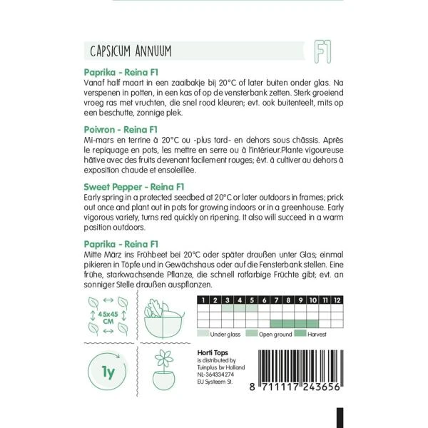 Paprika Solera F1, zaaien vanaf half maart in een zaaibakje bij zo’n 20° C of iets later buiten onder glas. Later kunnen deze planten in de kas of op de vensterbank. Het is een sterkgroeiend ras waarvan de vruchten snel rood verkleuren. Ze kunnen ook buiten mits op een goed beschutte en zonnige plek!