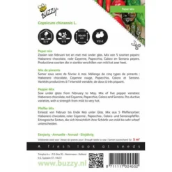 Een mix van 5 verschillende soorten pepers: Habanero chocolate, rode Cayenne, Pepecchia, Caloro en Serrano pepers. Allemaal productieve soorten die sterk verschillen in smaak, van mild tot zeer hete pepers. Habanero chocolate is één van de heetste pepersoorten ter wereld. Hij dankt zijn naam aan zijn chocolade kleur. Rode cayenne is een gemiddelde pepersoort en wordt vaak gebruikt om gerechten op smaak te brengen. Pepecchia is een milde, zoete peper, alsook de Caloro. Een kegelvormige peper die van groen naar geel verkleurt. De Serrano peper is een hete chilipeper met kogelvormige vruchten die verkleuren van groen naar rood.